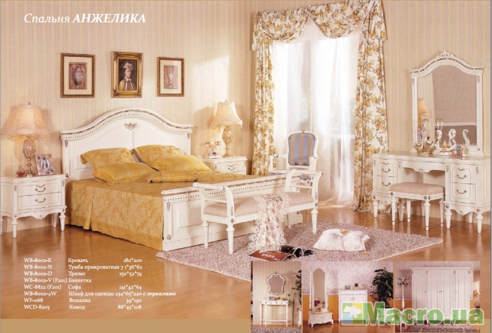 Спальня Анжелика 8002 выглядит достаточно элегантно, роскошно, нарядно, позитивно и сделана в очень модном дизайне и позитивном направлении, за счет чего удается легко в нее влюбиться и покорить достаточно большое количество потенциальных клиентов. Купить спальню Анжелика 8002 предлагается с совершенно необычным и ярким молочным оттенком поверхности, который по другому называется цветом слоновой кости, при этом благородность и яркость, мягкость и утонченность его будет выше, чем любое другое предложения подобной серии. Отзывы спальни Анжелика 8002 оценивают такое предложение как уникальное, тем более что в основе каждого предмета мебели положен материал МДФ, а также натуральный массив дерева.