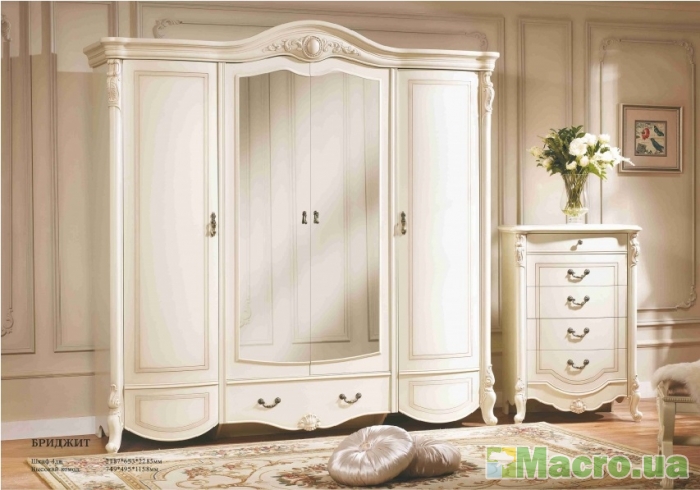 Спальня Бриджит сделана в очень тонком и элегантном английском стиле, который как минимум сможет позиционировать особенно эту мебель, так, как ни одна другая Вам не была приятна до этого момента. Купить спальню Бриджит можно с кроватью полуторного или двуспального исполнения, при этом ширина спального ложа соответственно может варьироваться или в 1.6 метров, или в 1.8 метров. Соответственно придется подыскать такой же матрас, который дополнительно по соответствующей заявке будет обеспечен нашей компанией. Отзывы спальни Бриджит покажут не плохую и полную ее комплектацию, в которую войдет прикроватная тумбочка, туалетный столик, пуфик, журнальный столик, шкаф и т.д.